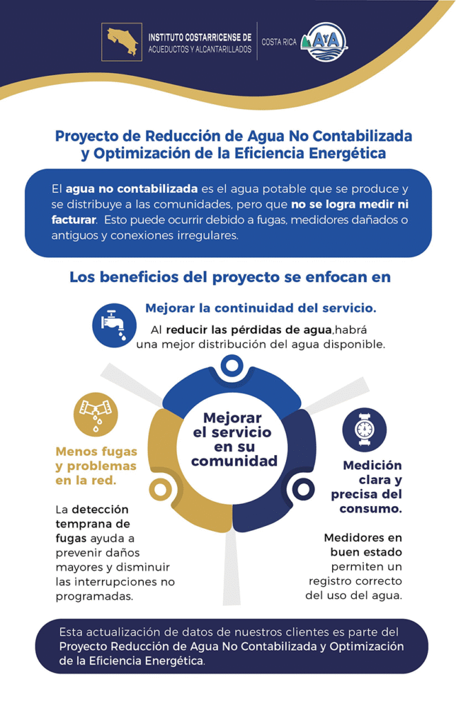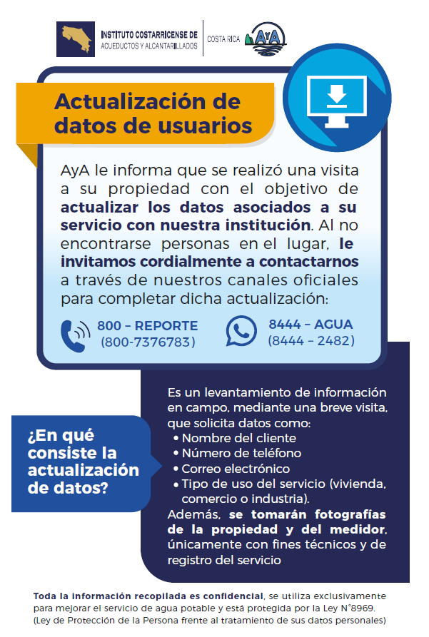 Toda la información recopilada estará protegida por la Ley de Protección de la Persona frente al Tratamiento de sus Datos Personales (Ley N.° 8968), y será utilizada exclusivamente por el AyA para la actualización del catastro y el desarrollo del Proyecto RANC, orientado a reducir pérdidas físicas y comerciales de agua.